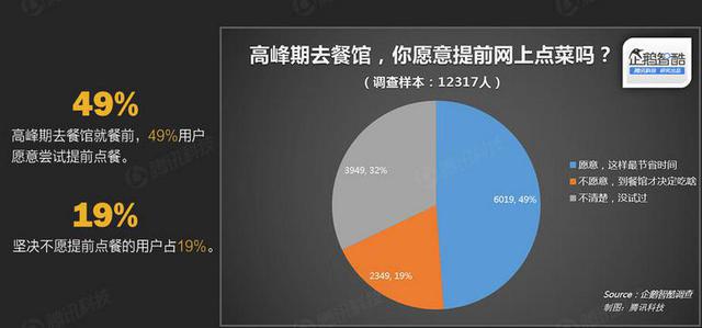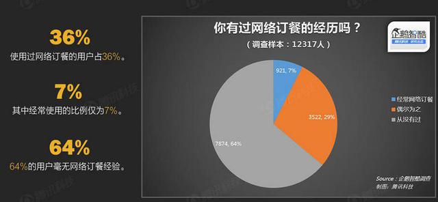最关键的一点是,外卖市场还未被完全开发,大量有外卖需求的人,并没有被满足。据腾讯科技企鹅智库的调查数据显示,6成以上的用户还没使用过网络订餐,但49%的人有意愿去尝试网络订餐。如此可以简单理解为,至少有3成的市场是有需求的。